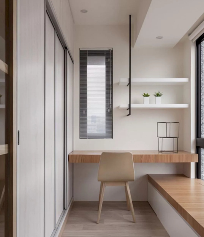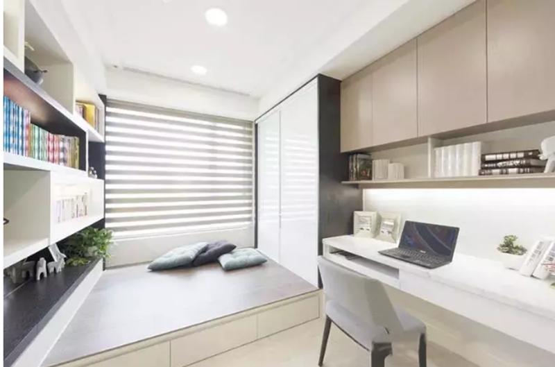 在装饰设计中,我们可以用榻榻米来延伸房间的凸窗,同时搭配定制的工作台,业余时间也可以躺在榻榻米上阅读,也可以做客房的功能,非常方便。