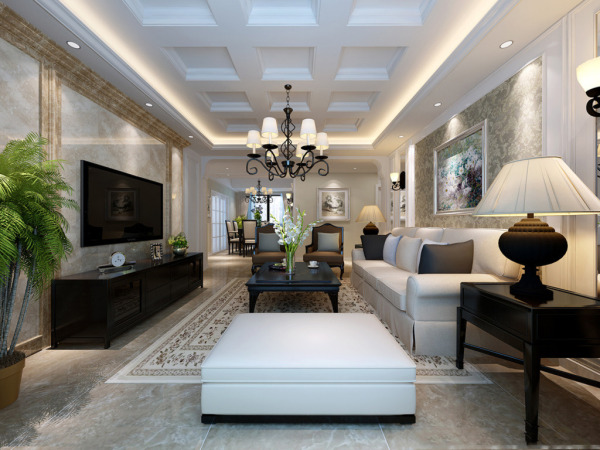 3.如果别墅客厅的高度太高,可以用灯光来弥补房间的空虚感。同时,也可以用石膏线在合适的位置表示分隔线。另外,客厅可以用窗帘垂直分成两层,更显别墅的奢华。