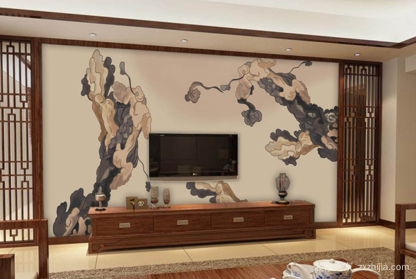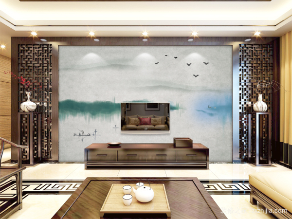 2.有些人更喜欢山水,这样你就可以把山水作为最背景的。这样的背景墙会给人一种开阔视野的效果,扩大格局。有山有水。最好有动物、鱼或鸟。有很多这样的群体。你可以选择你最喜欢的水画,或者你可以在网上查看哪些山水画更适合你的风格